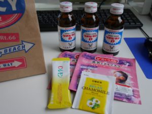 ドーナツ、栄養ドリンク、ビタミンC、蒸気アイマスク等々・・・